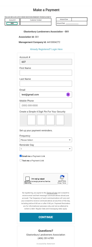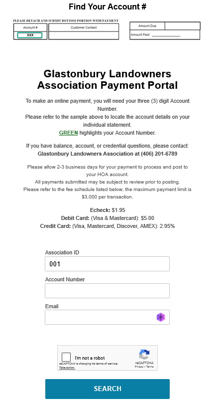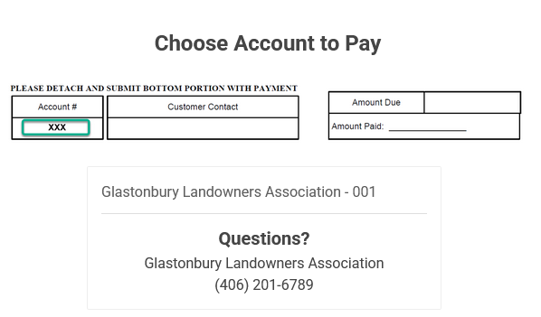 Find Your Account Number - The image to your left is the second page you should see. Please note that you will need your 3-digit GLA account number to create an account and make a payment. They will be included with the 2026 statements on the bottom tear-off tab. Or you may email us at info@glamontana.org and request your account number. The Association ID is 001 and already entered. You only need to enter your 3-digit GLA account number and your primary email.